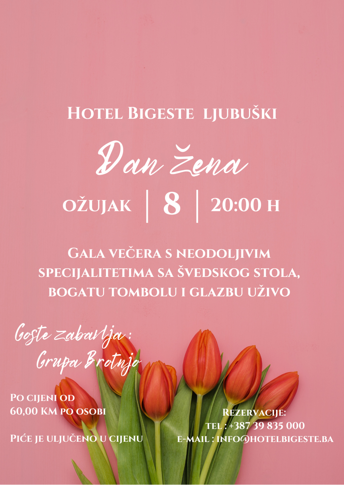 Drage dame,proslavite svoj dan u prekrasnom ambijentu našega hotela uz opuštajuću večeru, bogatu gastronomsku ponudu i izvrstan zabavni program. Za vrhunsku atmosferu pobrinut će se grupa Brotnjo, koja će večer učiniti nezaboravnom. Cijena večere po osobi je 60,00 KM, piće je uključeno u cijenu. Za informacije i rezervacije kontaktirajte nas na: info@hotelbigeste.ba ili na broj […]